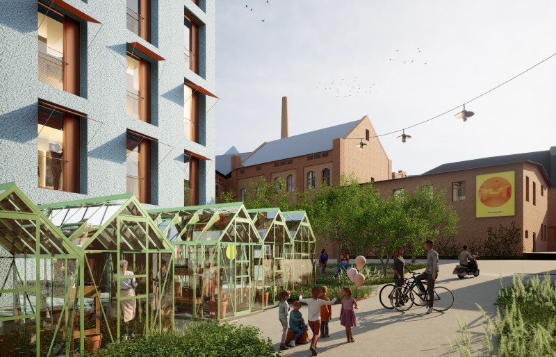 Community interaction is encouraged through shared greenhouses and a unified landscape design for the entire quarter.